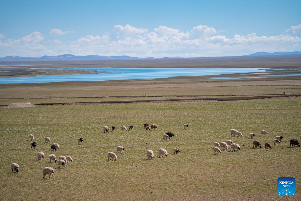 LHASA, 23 junio, 2024 (Xinhua) -- Imagen del 22 de junio de 2024 de ovejas pastando cerca del Lago Serling Tso, en la región autónoma de Xizang, en el suroeste de China. Localizado en la Reserva Natural Nacional de Qiangtang, el Lago Serling Tso es el lago más grande de la región autónoma de Xizang. Con la mejora de las condiciones del tráfico alrededor del lago en los últimos años, más turistas están visitando para disfrutar del paisaje único. (Xinhua/Tenzin Nyida)