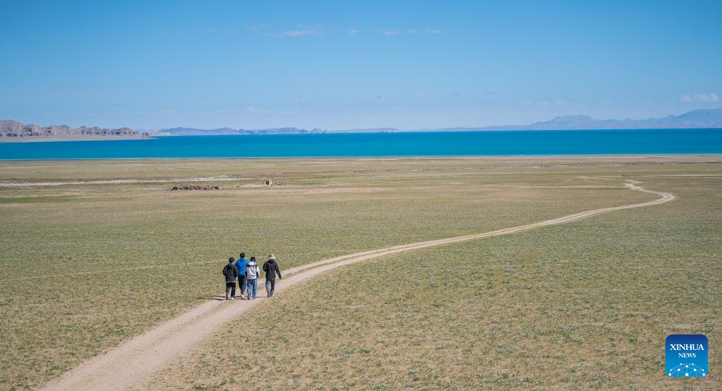 LHASA, 23 junio, 2024 (Xinhua) -- Imagen del 22 de junio de 2024 de turistas disfrutando del paisaje del Lago Serling Tso, en la región autónoma de Xizang, en el suroeste de China. Localizado en la Reserva Natural Nacional de Qiangtang, el Lago Serling Tso es el lago más grande de la región autónoma de Xizang. Con la mejora de las condiciones del tráfico alrededor del lago en los últimos años, más turistas están visitando para disfrutar del paisaje único. (Xinhua/Tenzin Nyida)