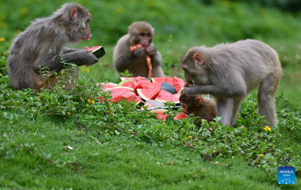 HAIKOU, 23 junio, 2024 (Xinhua) -- Monos disfrutan una sandía en el Parque de Vida Silvestre Tropical y Jardín Botánico de Hainan, en Haikou, en la provincia de Hainan, en el sur de China, el 23 de junio de 2024. Mientras las olas de calor golpean la provincia de Hainan, el Parque de Vida Silvestre Tropical y Jardín Botánico de Hainan, provee a los animales con frutas, hielo y duchas para ayudarles a mantenerse frescos en el verano. (Xinhua/Guo Cheng)