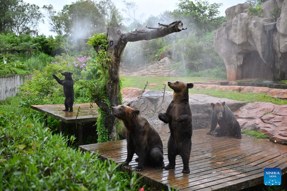 HAIKOU, 23 junio, 2024 (Xinhua) -- Osos pardos disfrutan de una ducha en el Parque de Vida Silvestre Tropical y Jardín Botánico de Hainan, en Haikou, en la provincia de Hainan, en el sur de China, el 23 de junio de 2024. Mientras las olas de calor golpean la provincia de Hainan, el Parque de Vida Silvestre Tropical y Jardín Botánico de Hainan, provee a los animales con frutas, hielo y duchas para ayudarles a mantenerse frescos en el verano. (Xinhua/Guo Cheng)