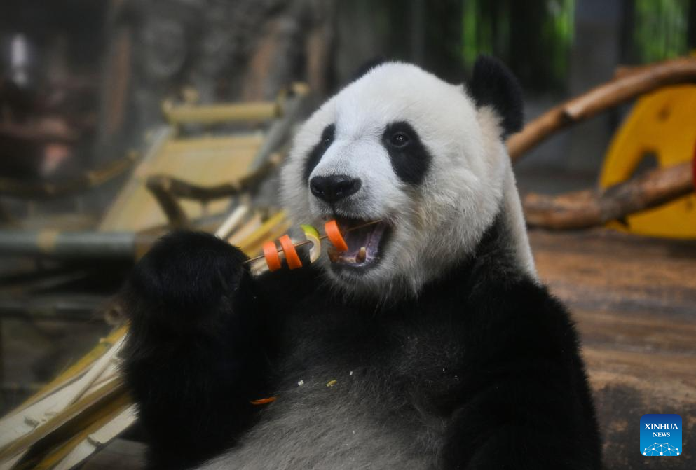 HAIKOU, 23 junio, 2024 (Xinhua) -- El panda gigante Gong Gong disfruta de frutas y vegetales fríos en el Parque de Vida Silvestre Tropical y Jardín Botánico de Hainan, en Haikou, en la provincia de Hainan, en el sur de China, el 23 de junio de 2024. Mientras las olas de calor golpean la provincia de Hainan, el Parque de Vida Silvestre Tropical y Jardín Botánico de Hainan, provee a los animales con frutas, hielo y duchas para ayudarles a mantenerse frescos en el verano. (Xinhua/Guo Cheng)