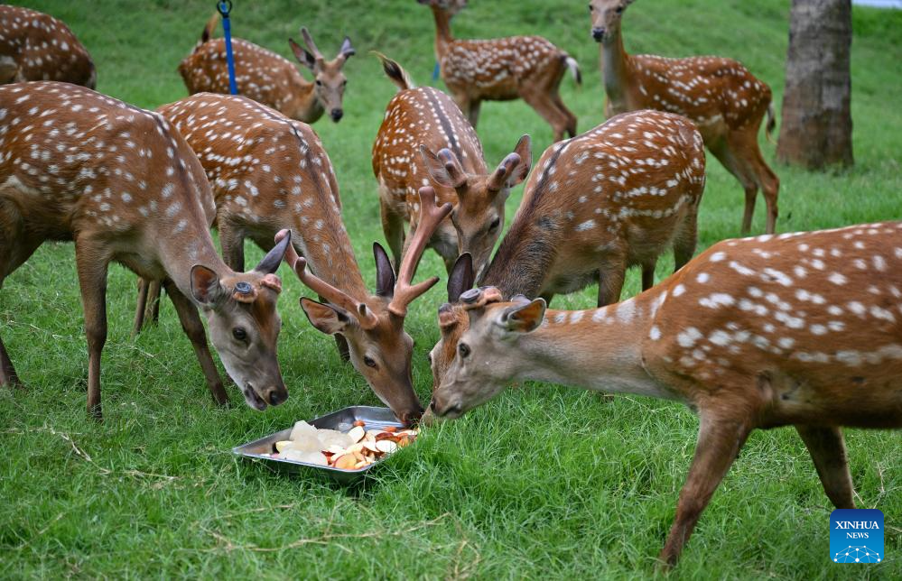 HAIKOU, 23 junio, 2024 (Xinhua) -- Ciervos sika disfrutan frutas y vegetales fríos en el Parque de Vida Silvestre Tropical y Jardín Botánico de Hainan, en Haikou, en la provincia de Hainan, en el sur de China, el 23 de junio de 2024. Mientras las olas de calor golpean la provincia de Hainan, el Parque de Vida Silvestre Tropical y Jardín Botánico de Hainan provee a los animales con frutas, hielo y duchas para ayudarles a mantenerse frescos en el verano. (Xinhua/Guo Cheng)