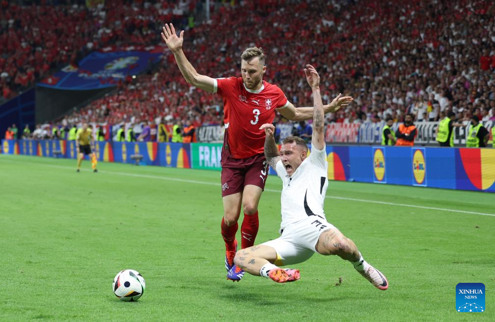 FRANKFURT, 24 junio, 2024 (Xinhua) -- Imagen del 23 de junio de 2024 de David Raum (d), de Alemania, disputando el balón con Silvan Widmer, de Suiza, durante el partido correspondiente al Grupo A de la EURO 2024 de la UEFA, entre Alemania y Suiza, en Frankfurt, Alemania. (Xinhua/Bai Xuefei)