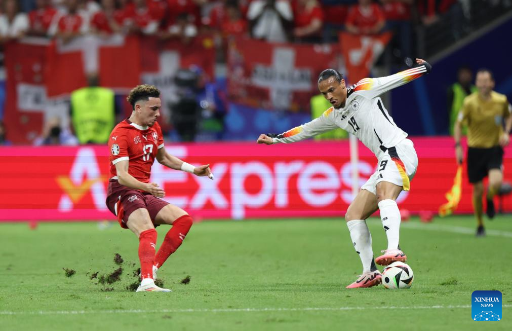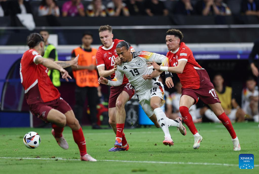FRANKFURT, 24 junio, 2024 (Xinhua) -- Imagen del 23 de junio de 2024 de Leroy Sane (2-d), de Alemania, abriéndose paso durante el partido correspondiente al Grupo A de la EURO 2024 de la UEFA, entre Alemania y Suiza, en Frankfurt, Alemania. (Xinhua/Bai Xuefei)