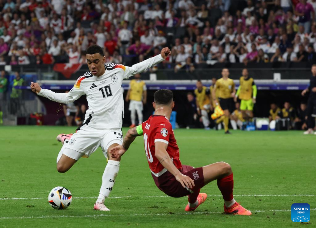 FRANKFURT, 24 junio, 2024 (Xinhua) -- Imagen del 23 de junio de 2024 de Jamal Musiala (i), de Alemania, disparando el balón durante el partido correspondiente al Grupo A de la EURO 2024 de la UEFA, entre Alemania y Suiza, en Frankfurt, Alemania. (Xinhua/Zhang Fan)