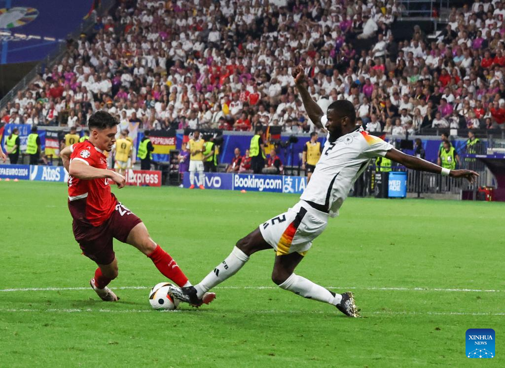 FRANKFURT, 24 junio, 2024 (Xinhua) -- Imagen del 23 de junio de 2024 de Antonio Rudiger (d), de Alemania, disputando el balón con Fabian Rieder, de Suiza, durante el partido correspondiente al Grupo A de la EURO 2024 de la UEFA, entre Alemania y Suiza, en Frankfurt, Alemania. (Xinhua/Zhang Fan)