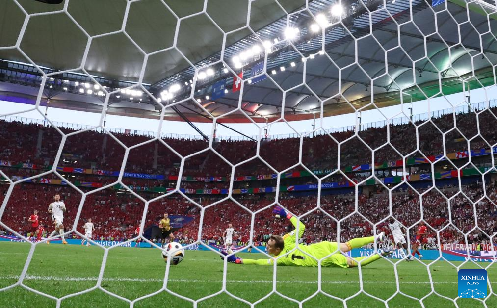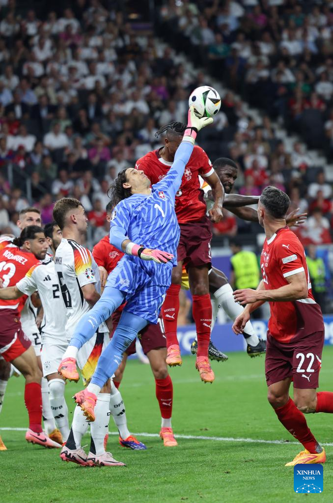 FRANKFURT, 24 junio, 2024 (Xinhua) -- Imagen del 23 de junio de 2024 del guardameta Yann Sommer (frente), de Suiza, atajando el balón durante el partido correspondiente al Grupo A de la EURO 2024 de la UEFA, entre Alemania y Suiza, en Frankfurt, Alemania. (Xinhua/Bai Xuefei)