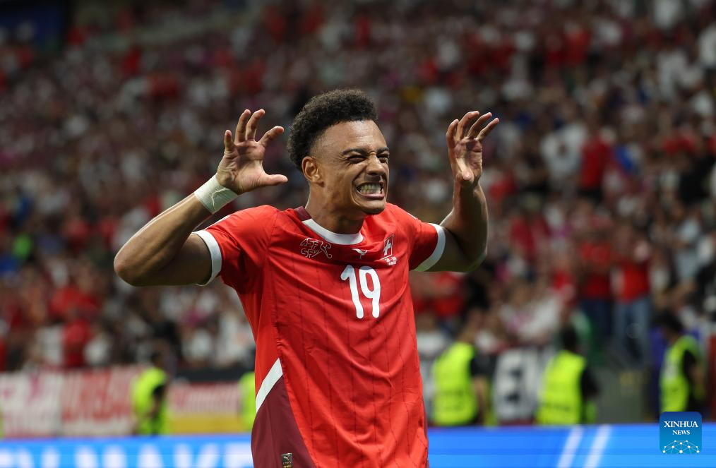FRANKFURT, 24 junio, 2024 (Xinhua) -- Imagen del 23 de junio de 2024 de Dan Ndoye, de Suiza, festejando su anotación durante el partido correspondiente al Grupo A de la EURO 2024 de la UEFA, entre Alemania y Suiza, en Frankfurt, Alemania. (Xinhua/Bai Xuefei)