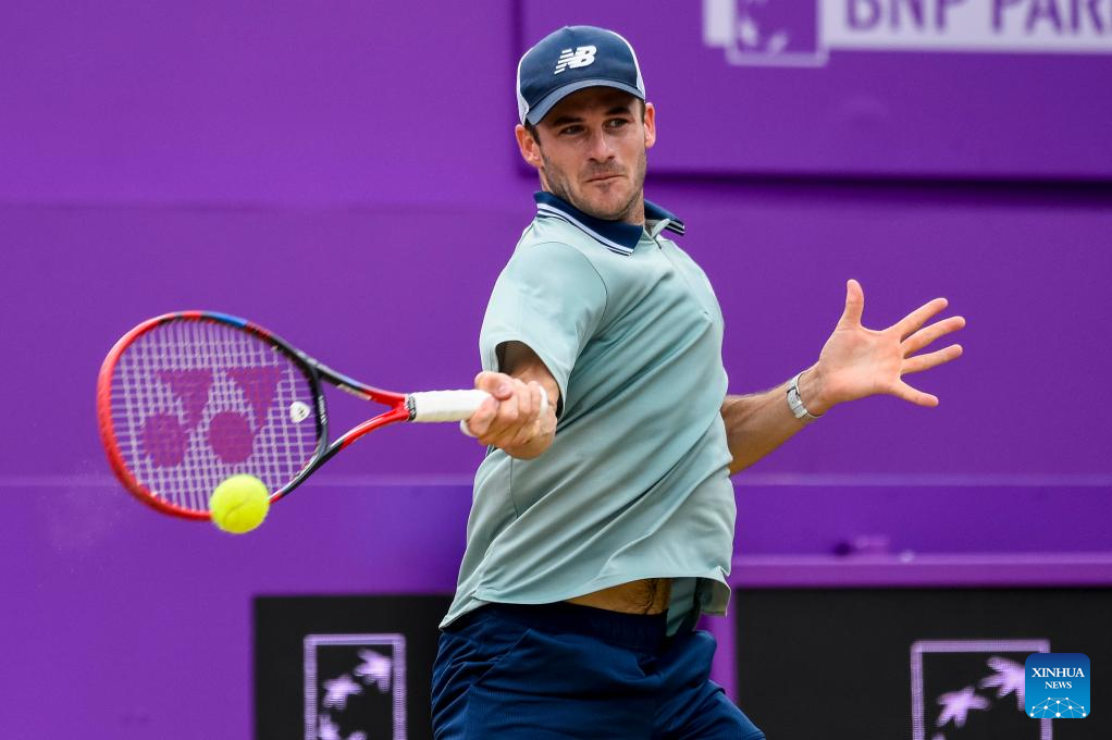 LONDRES, 24 junio, 2024 (Xinhua) -- Imagen del 23 de junio de 2024 de Tommy Paul, de Estados Unidos, devolviendo la pelota durante el partido final de individuales masculinos entre Tommy Paul, de Estados Unidos, y Lorenzo Musetti, de Italia, en el Cinch Championships de la ATP en el Queen's Club, en Londres, Reino Unido. (Xinhua/Stephen Chung)