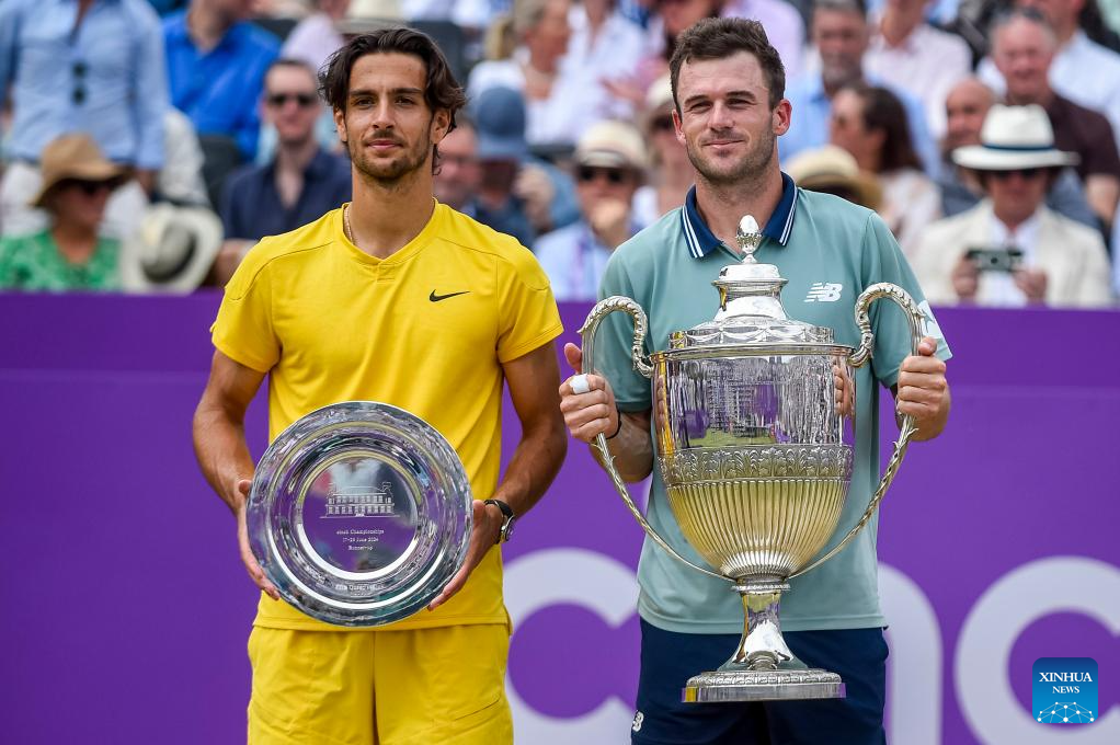 LONDRES, 24 junio, 2024 (Xinhua) -- Imagen del 23 de junio de 2024 de Tommy Paul (d), de Estados Unidos, y Lorenzo Musetti, de Italia, posando para fotografías en la ceremonia de premiación al término del partido final de individuales masculinos entre Tommy Paul, de Estados Unidos, y Lorenzo Musetti, de Italia, en el Cinch Championships de la ATP en el Queen's Club, en Londres, Reino Unido. (Xinhua/Stephen Chung)