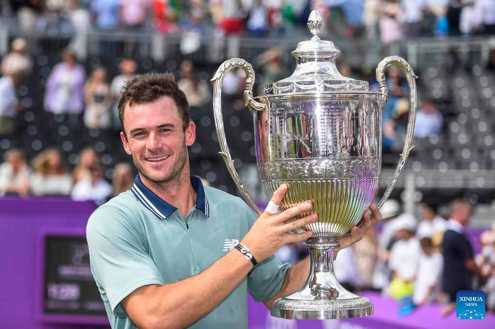 LONDRES, 24 junio, 2024 (Xinhua) -- Imagen del 23 de junio de 2024 de Tommy Paul, de Estados Unidos, festejando con el trofeo en la ceremonia de premiación al término del partido final de individuales masculinos entre Tommy Paul, de Estados Unidos, y Lorenzo Musetti, de Italia, en el Cinch Championships de la ATP en el Queen's Club, en Londres, Reino Unido. (Xinhua/Stephen Chung)