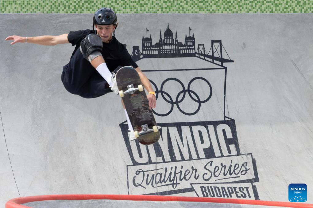 BUDAPEST, 24 junio, 2024 (Xinhua) -- Imagen del 23 de junio de 2024 de Keegan Palmer, de Australia, compitiendo durante la final de park masculino de skateboarding en las Series de Clasificación Olímpica de Budapest, en Budapest, Hungría. (Xinhua/Attila Volgyi)