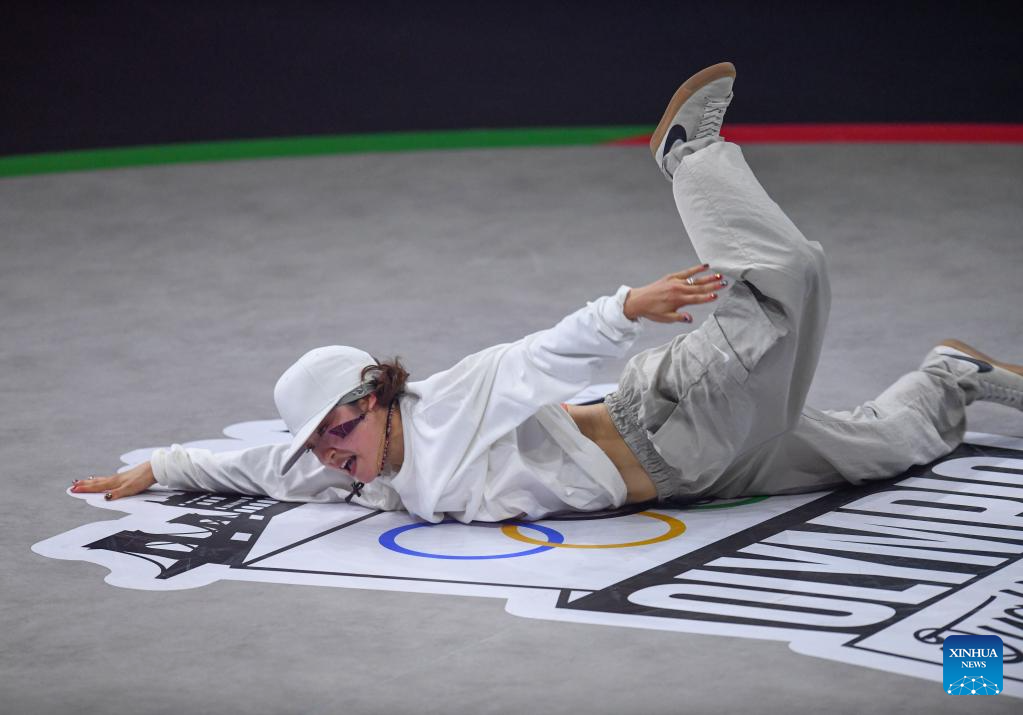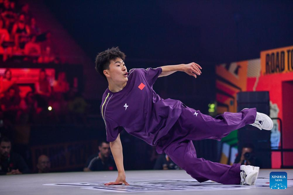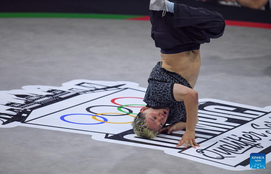 BUDAPEST, 24 junio, 2024 (Xinhua) -- Imagen del 23 de junio de 2024 de Qi Xiangyu, de China, compitiendo durante el round robin de B-Boys de breaking en las Series de Clasificación Olímpica de Budapest, en Budapest, Hungría. (Xinhua/Lian Yi)