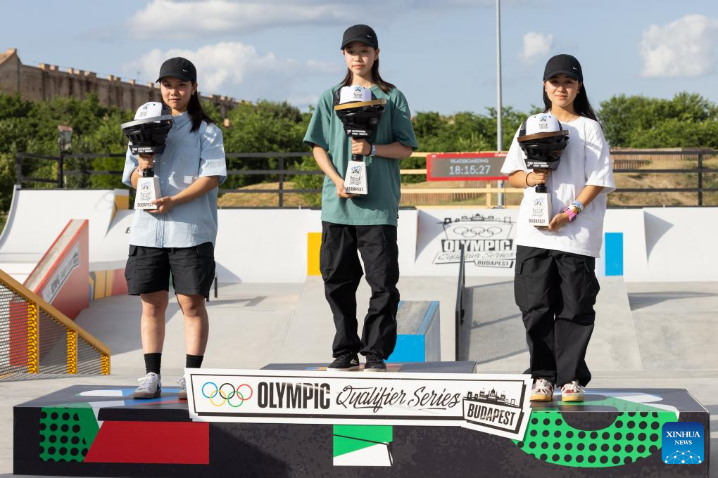 BUDAPEST, 24 junio, 2024 (Xinhua) -- Imagen del 23 de junio de 2024 de Oda Yumeka (i), de Japón, Yoshizawa Coco (c), de Japón y Nakayama Funa, de Japón posando durante la ceremonia de premiación de la final femenina de street de skateboarding en las Series de Clasificación Olímpica de Budapest, en Budapest, Hungría. (Xinhua/Attila Volgyi)