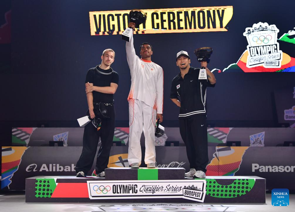 BUDAPEST, 24 junio, 2024 (Xinhua) -- Imagen del 23 de junio de 2024 del primer lugar, Lee-Lou Demierre (c), de Países Bajos, el segundo lugar, Amir Zakirov (i), de Kazajistán, y el tercer lugar, Kim Hong-yul, de República de Corea, asistiendo a la ceremonia de premiación después de las finales de B-Boys de breaking en las Series de Clasificación Olímpica de Budapest, en Budapest, Hungría. (Xinhua/Lian Yi)