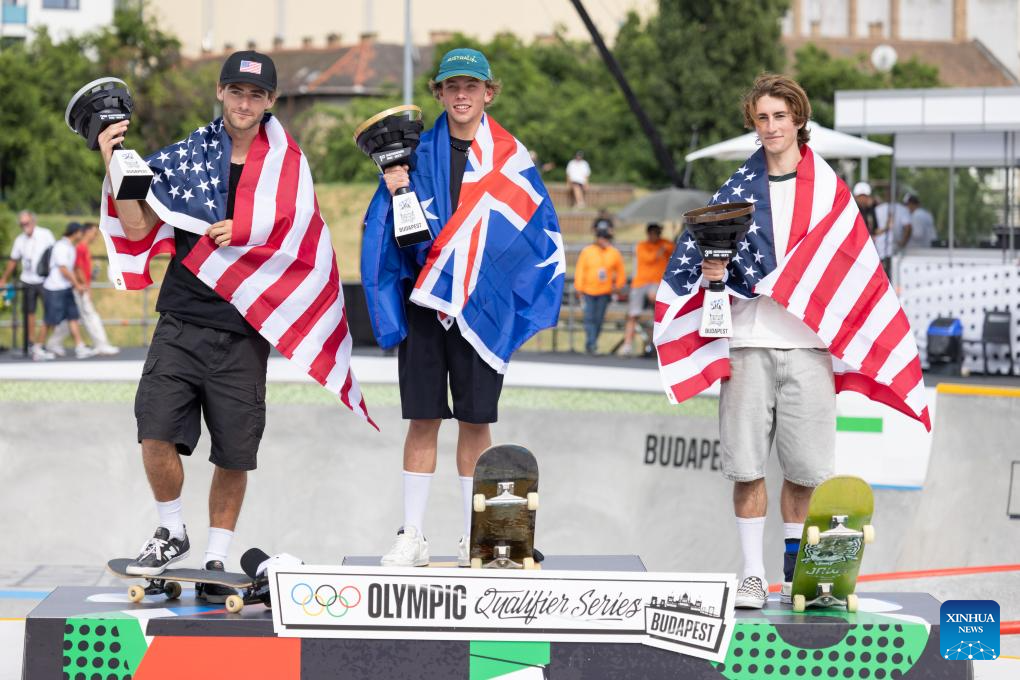 BUDAPEST, 24 junio, 2024 (Xinhua) -- Imagen del 23 de junio de 2024 del medallista de plata, Tom Schaar (i), de Estados Unidos, el medallista de oro, Keegan Palmer (c), de Australia, y el medallista de bronce, Tate Carew, de Estados Unidos, posando en el podio después de la final de park masculino de skateboarding en las Series de Clasificación Olímpica de Budapest, en Budapest, Hungría. (Xinhua/Attila Volgyi)