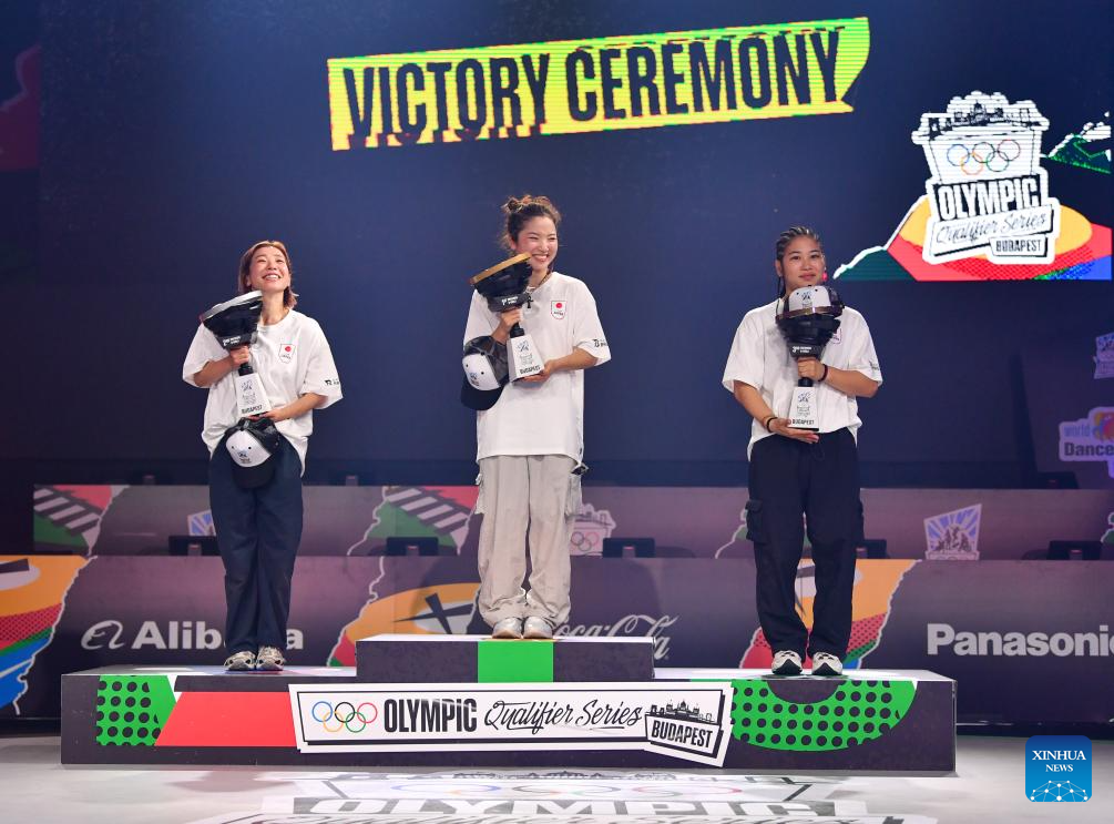BUDAPEST, 24 junio, 2024 (Xinhua) -- Imagen del 23 de junio de 2024 del primer lugar, Yuasa Ami (c), el segundo lugar, Fukushima Ayumi (i), y el tercer lugar, Tsuhako Riko, de Japón, asistiendo a la ceremonia de entrega de premios al término de la final de B-Girls de breaking en las Series de Clasificación Olímpica de Budapest, en Budapest, Hungría. (Xinhua/Lian Yi)
