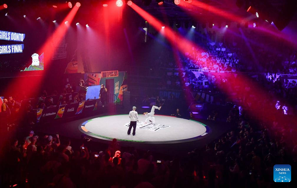 BUDAPEST, 24 junio, 2024 (Xinhua) -- Imagen del 23 de junio de 2024 de Yuasa Ami (d), de Japón, compitiendo durante la final de B-Girls de breaking en las Series de Clasificación Olímpica de Budapest, en Budapest, Hungría. (Xinhua/Lian Yi)