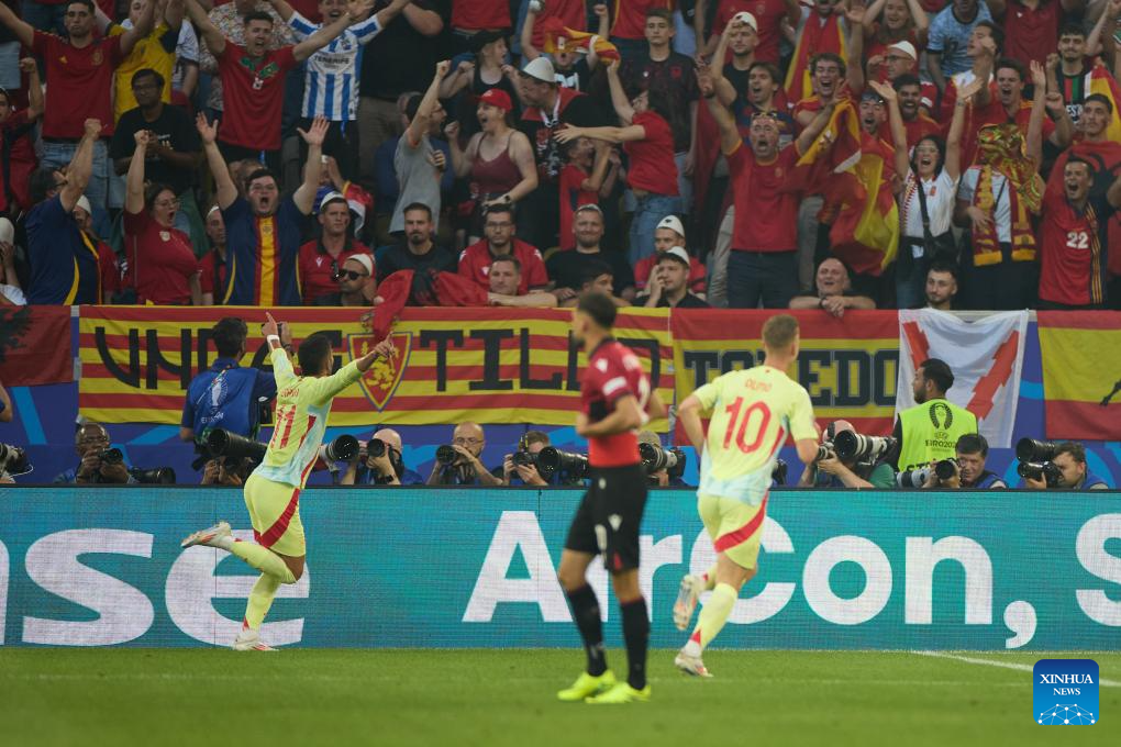 DUSSELDORF, 25 junio, 2024 (Xinhua) -- Imagen del 24 de junio de 2024 de Ferran Torres (i), de España, festejando durante el partido correspondiente al Grupo B de la EURO 2024 de la UEFA, entre España y Albania, en Dusseldorf, Alemania. (Xinhua/Meng Dingbo)