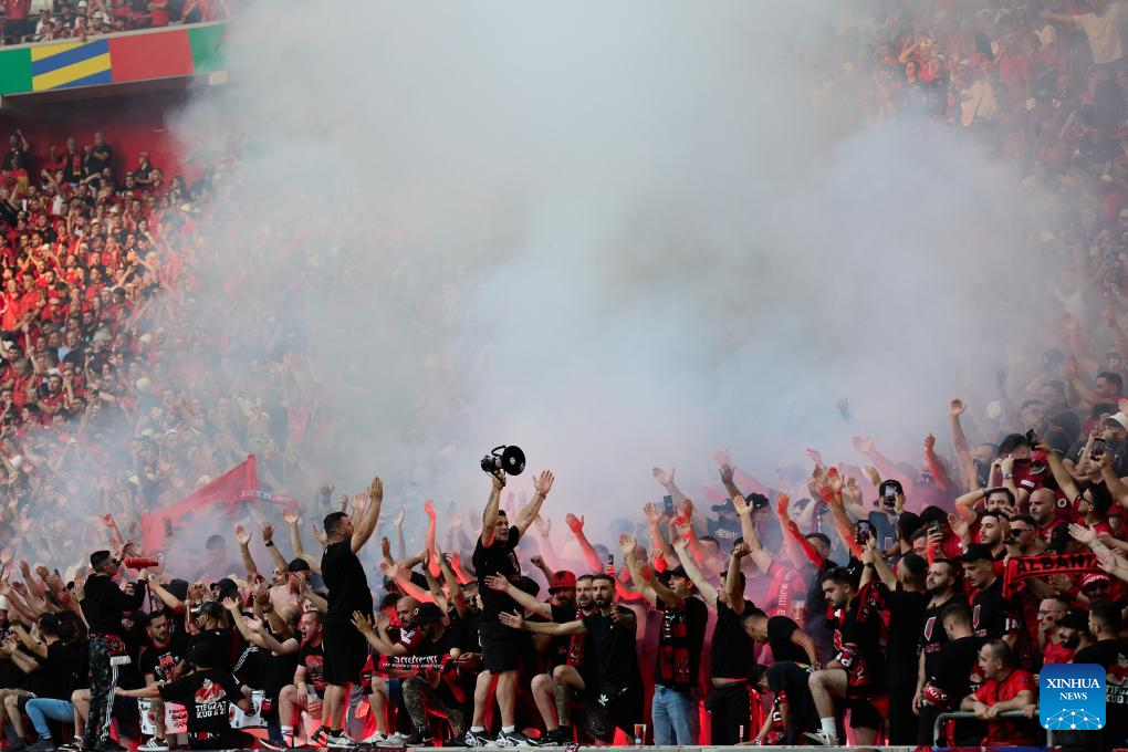 DUSSELDORF, 25 junio, 2024 (Xinhua) -- Imagen del 24 de junio de 2024 de aficionados del equipo de Albania reuniéndose previo al partido correspondiente al Grupo B de la EURO 2024 de la UEFA, entre España y Albania, en Dusseldorf, Alemania. (Xinhua/Meng Dingbo)