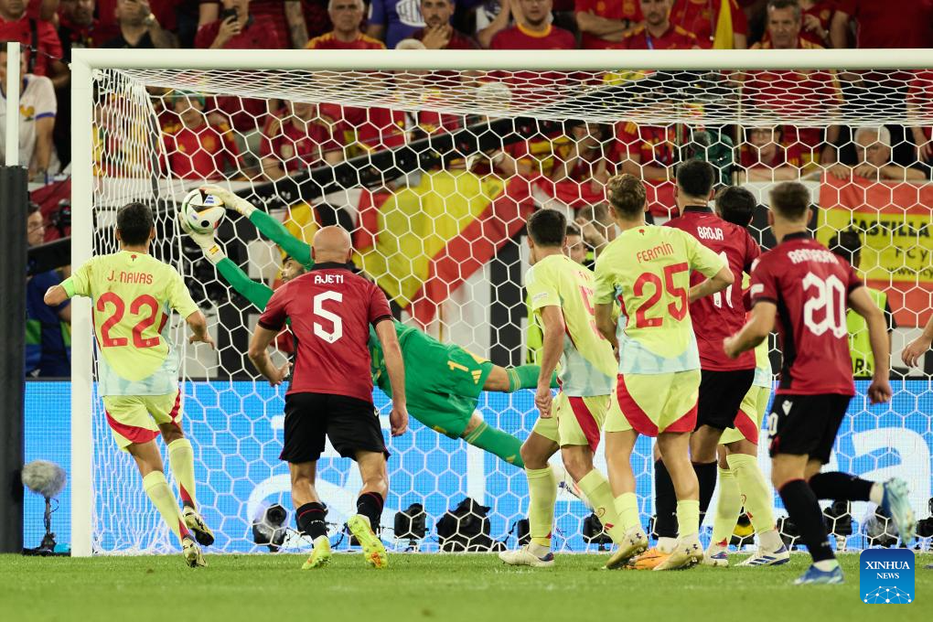 DUSSELDORF, 25 junio, 2024 (Xinhua) -- Imagen del 24 de junio de 2024 del guardameta David Raya Martín (atrás), de España, realizando una salvada durante el partido correspondiente al Grupo B de la EURO 2024 de la UEFA, entre España y Albania, en Dusseldorf, Alemania. (Xinhua/Meng Dingbo)