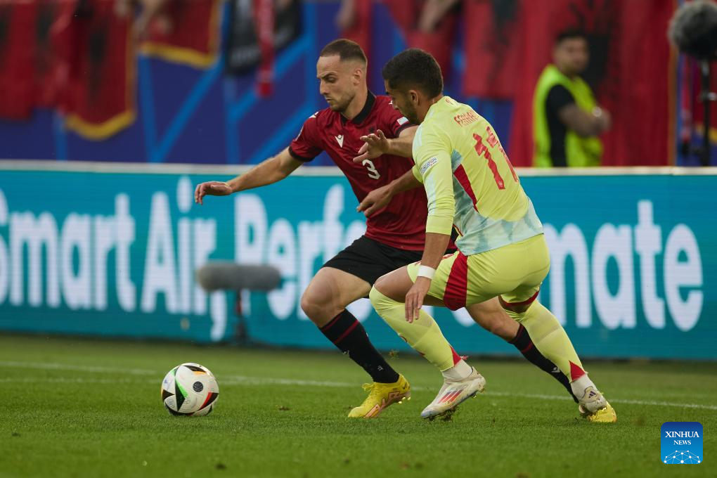 DUSSELDORF, 25 junio, 2024 (Xinhua) -- Imagen del 24 de junio de 2024 de Fermín López (d), de España, compitiendo con Berat Djimsiti, de Albania, durante el partido correspondiente al Grupo B de la EURO 2024 de la UEFA, entre España y Albania, en Dusseldorf, Alemania. (Xinhua/Meng Dingbo)