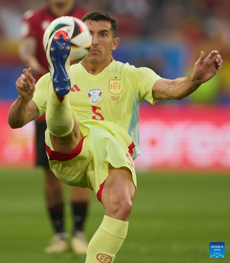 DUSSELDORF, 25 junio, 2024 (Xinhua) -- Imagen del 24 de junio de 2024 de Mikel Merino (arriba), de España, compitiendo durante el partido correspondiente al Grupo B de la EURO 2024 de la UEFA, entre España y Albania, en Dusseldorf, Alemania. (Xinhua/Meng Dingbo)