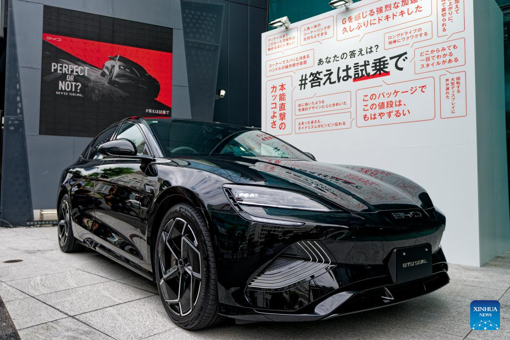 TOKIO, 25 junio, 2024 (Xinhua) -- Imagen del 25 de junio de 2024 de un BYD SEAL para pruebas de manejo, en Tokio, Japón. El fabricante de automóviles chino BYD presentó el martes en Japón su tercer vehículo eléctrico (VE), el SEAL, con el que la compañía se adentra en el mercado del sedán en el país. El SEAL estará disponible en dos versiones, ambas con una capacidad de batería de 82,56 kWh, según BYD Auto Japan Inc. en una conferencia de prensa en Tokio, anunciando el inicio de las ventas minoristas del sedán en todo el país. (Xinhua/Zhang Xiaoyu)