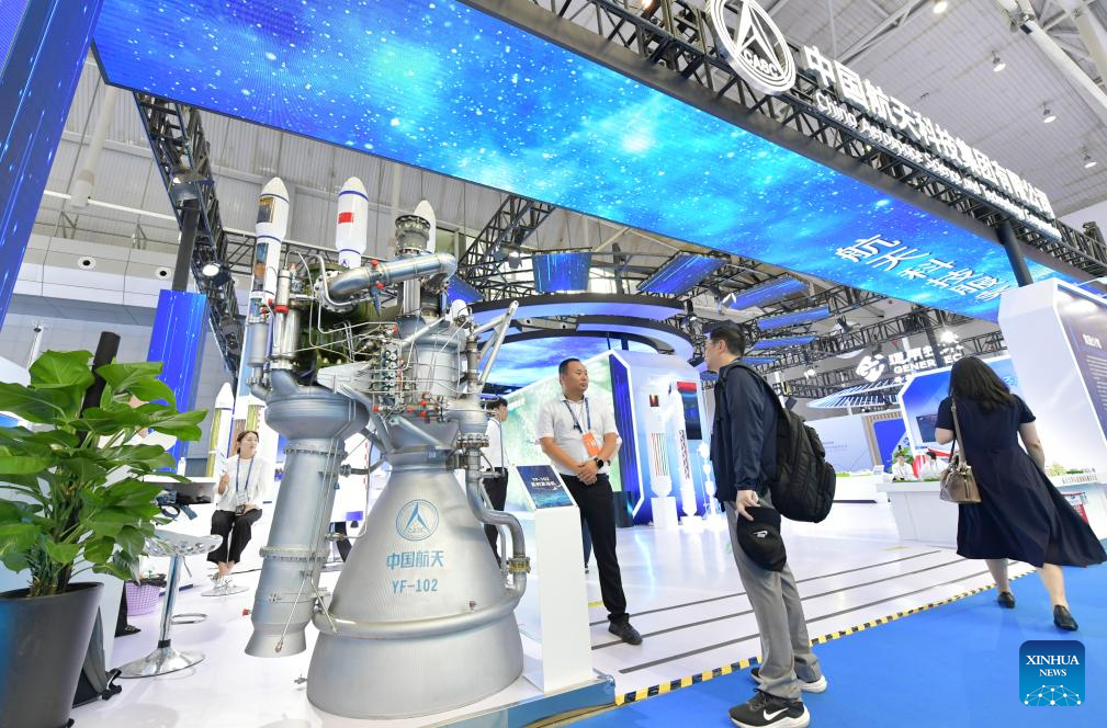URUMQI, 26 junio, 2024 (Xinhua) -- Un visitante observa una exhibición en el estand de la Corporación de Ciencia y Tecnología Aeroespacial de China en la VIII Exposición China-Eurasia, en Urumqi, en la región autónoma uygur de Xinjiang, en el noroeste de China, el 26 de junio de 2024. La VIII Exposición China-Eurasia, celebrada en el Centro Internacional de Convenciones y Exposiciones de Xinjiang, al pie de las montañas Tianshan, comenzó el miércoles en Urumqi, en la región autónoma uygur de Xinjiang, en el noroeste de China. Con el tema "Nuevas oportunidades de la Ruta de la Seda, Nueva Vitalidad para la Cooperación Euroasiática", la exposición se extenderá hasta el domingo. Ha atraído a más de 1.900 participantes de 50 países, regiones y organizaciones internacionales, mostrando más de 6.000 variedades de productos. (Xinhua/Wang Fei)