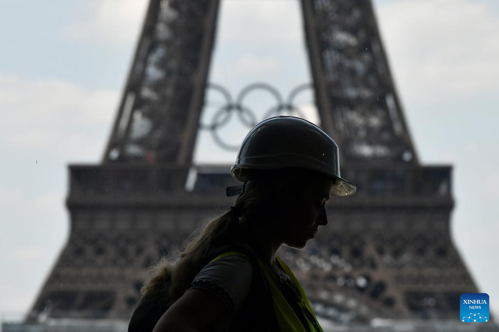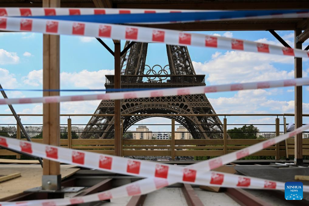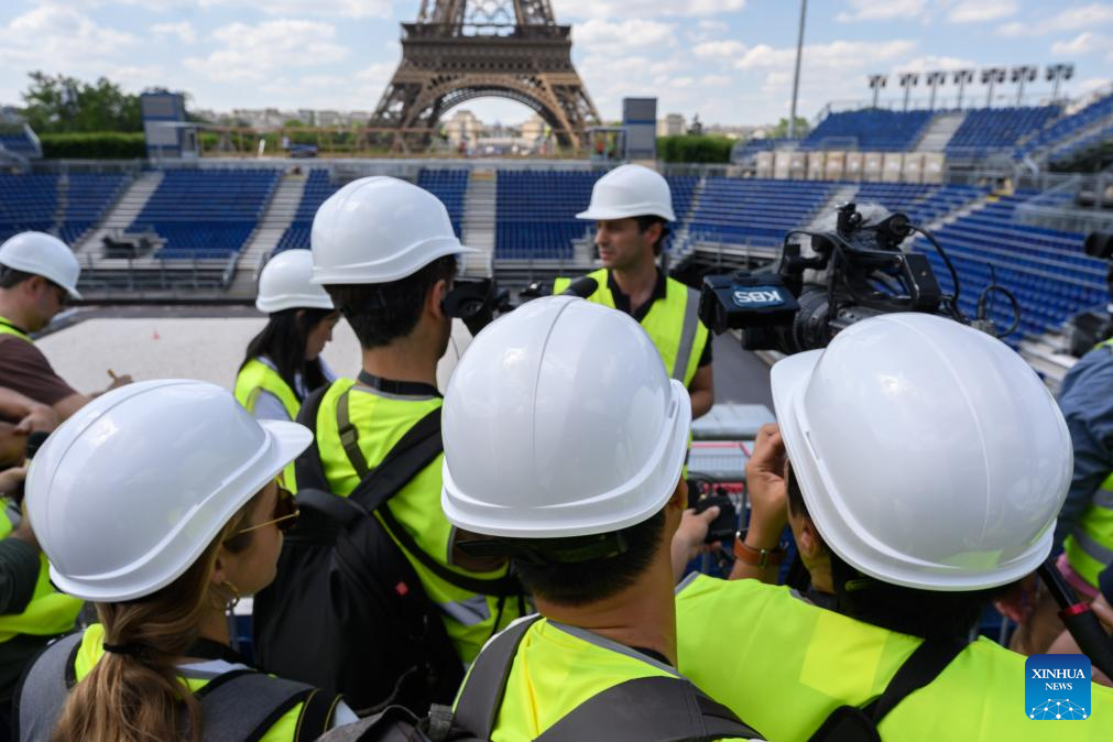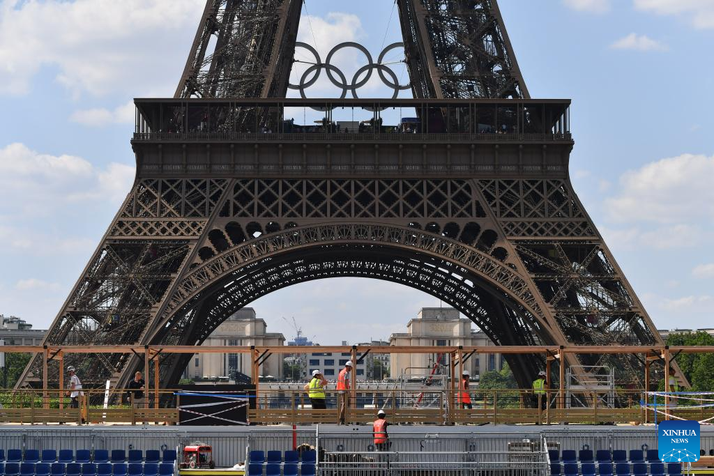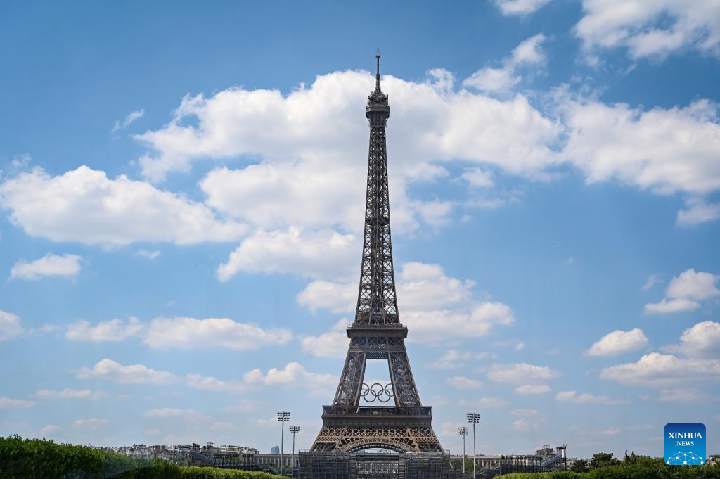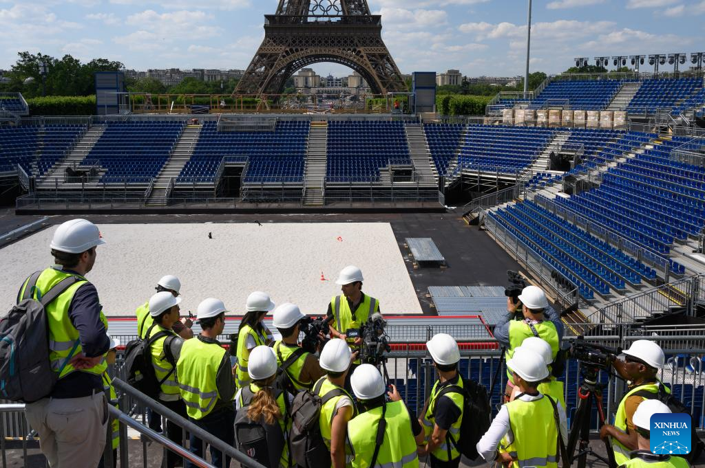 PARIS, 26 junio, 2024 (Xinhua) -- La Torre Eiffel es vista durante una visita de la prensa al Estadio de la Torre Eiffel, que albergará el voleibol de playa durante los Juegos Olímpicos de París 2024 y el fútbol para ciegos durante los Juegos Paralímpicos de París 2024, en París, Francia, el 26 de junio de 2024. (Xinhua/Julien Mattia)