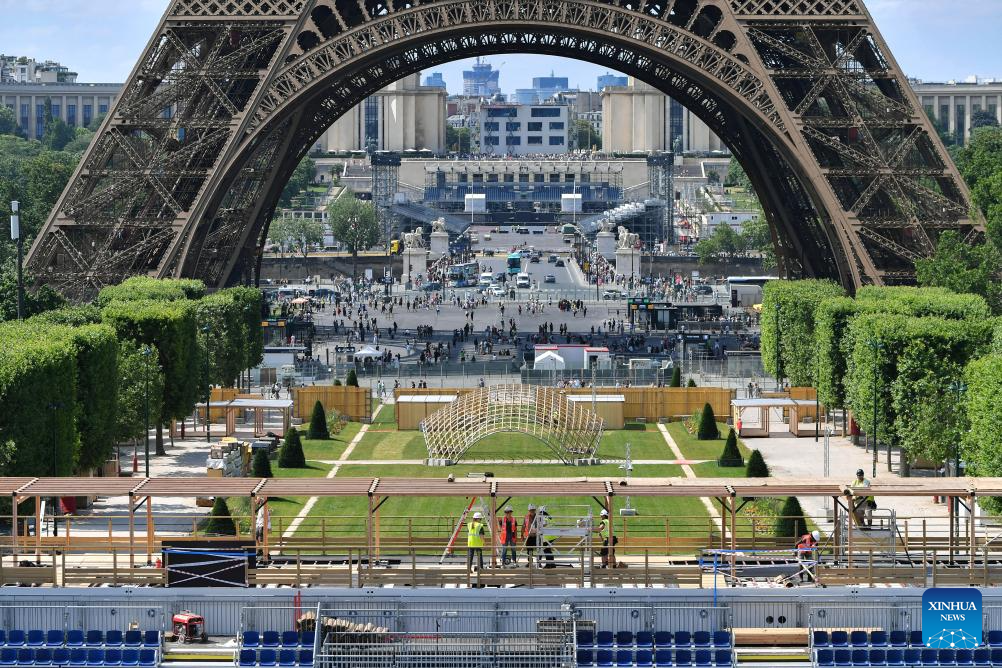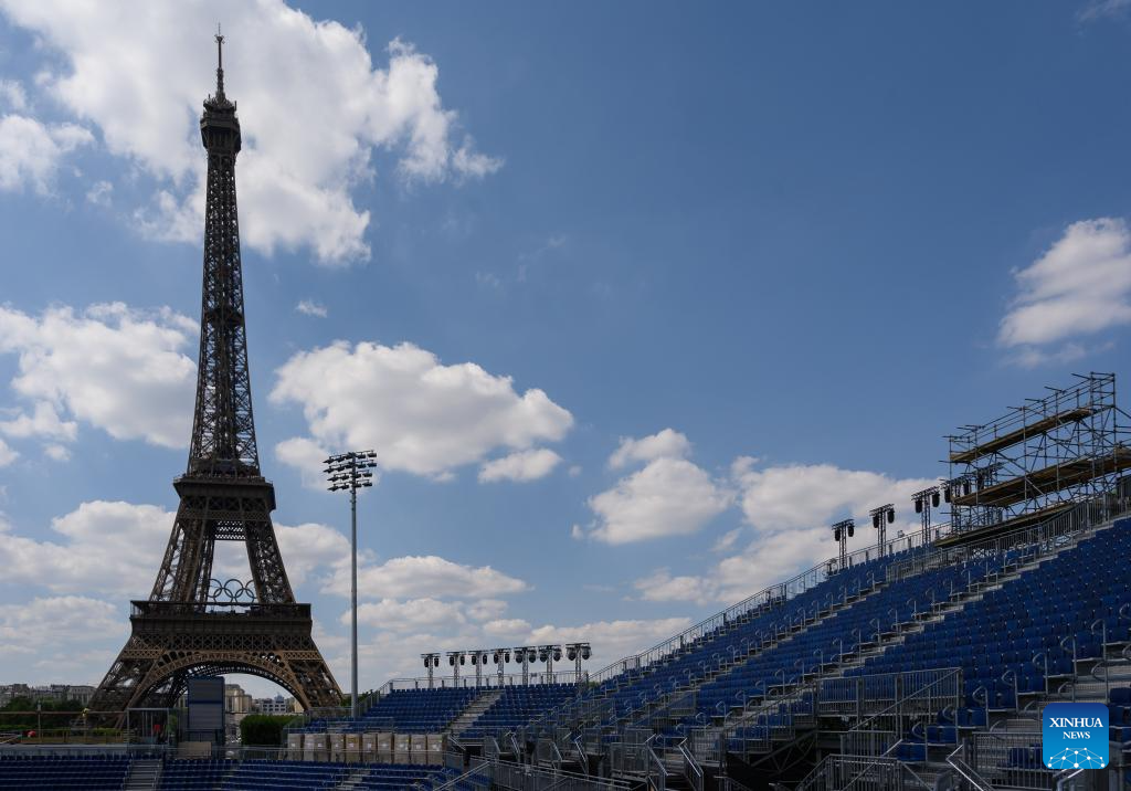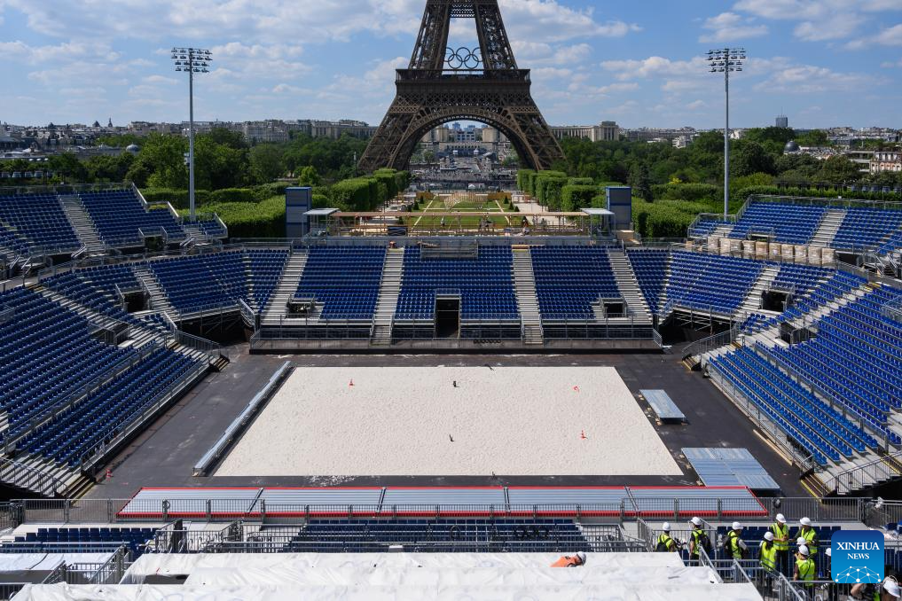 PARIS, 26 junio, 2024 (Xinhua) -- Imagen del 25 de junio de 2024 del Estadio de la Torre Eiffel, que albergará el voleibol de playa durante los Juegos Olímpicos de París 2024 y el fútbol para ciegos durante los Juegos Paralímpicos de París 2024, en París, Francia. (Xinhua/Julien Mattia)