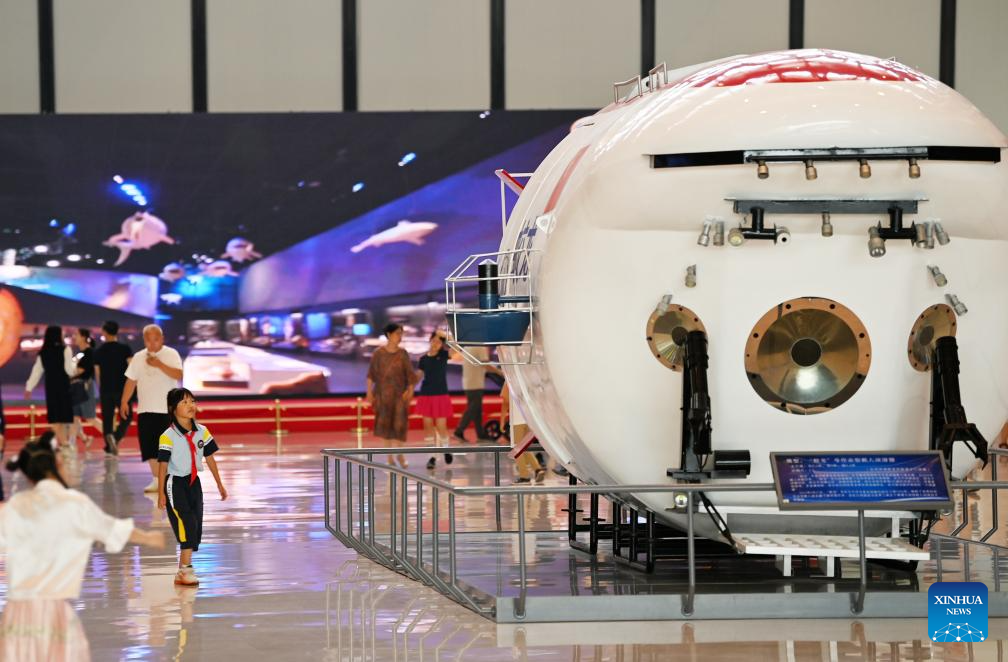 TIANJIN, 28 junio, 2024 (Xinhua) -- Personas observan un modelo del Jiaolong, el sumergible tripulado de aguas profundas de China, en el Museo Nacional Marítimo de China, en Tianjin, en el norte de China, el 28 de junio de 2024. El Museo Nacional Marítimo de China está ubicado en la Nueva Area de Binhai de Tianjin, cubriendo un área de 15 hectáreas. A medida que las vacaciones de verano se acercan, el número de visitantes al museo ha incrementado. (Xinhua/Li Ran)