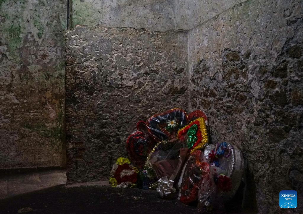 ACCRA, 23 agosto, 2024 (Xinhua) -- Imagen del 19 de junio de 2024 de coronas de flores en el calabozo del castillo de Cape Coast, una antigua instalación de retención de esclavos, en Cape Coast, Ghana. "Costa de los Esclavos" se refiere a una región histórica a lo largo de la costa de Africa Occidental. El nombre deriva de la trata transatlántica de esclavos en el continente. El 23 de agosto se conmemora el Día Internacional del Recuerdo de la Trata de Esclavos y de su Abolición. (Xinhua/Li Yahui)