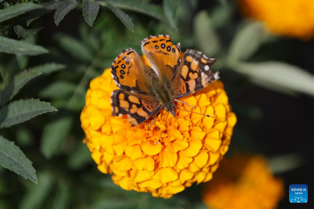 CIUDAD DE MEXICO, 30 octubre, 2024 (Xinhua) -- Imagen del 29 de octubre de 2024 de una mariposa posándose sobre una flor de cempasúchil, un elemento tradicional para las ofrendas de Día de Muertos, en la Ciudad de México, capital de México. (Xinhua/Francisco Cañedo)