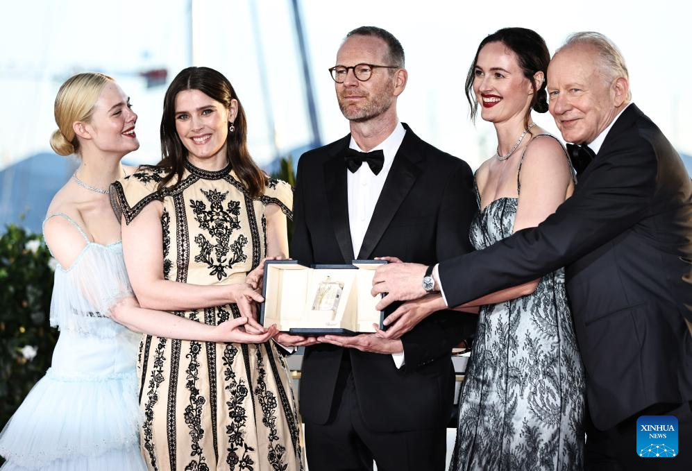 CANNES, 25 mayo, 2025 (Xinhua) -- Imagen del 24 de mayo de 2025 del director noruego, Joachim Trier (c), posando con miembros del elenco en una sesión fotográfica después de ganar el Gran Premio por la película "Sentimental Value" durante la ceremonia de clausura de la 78ª edición del Festival de Cine de Cannes, en Cannes, en el sur de Francia. (Xinhua/Gao Jing)