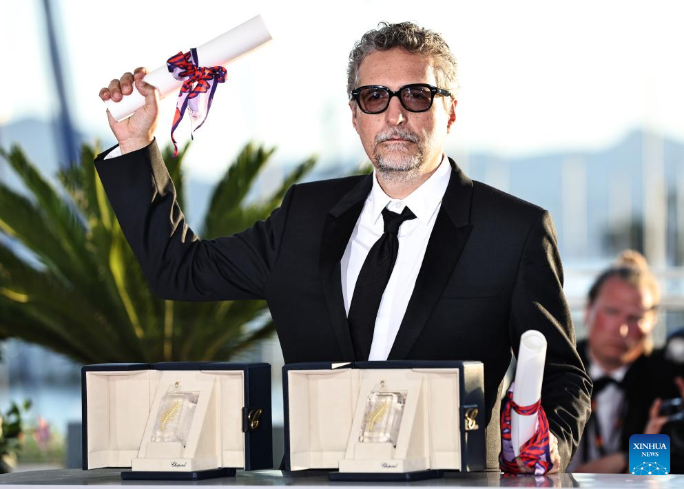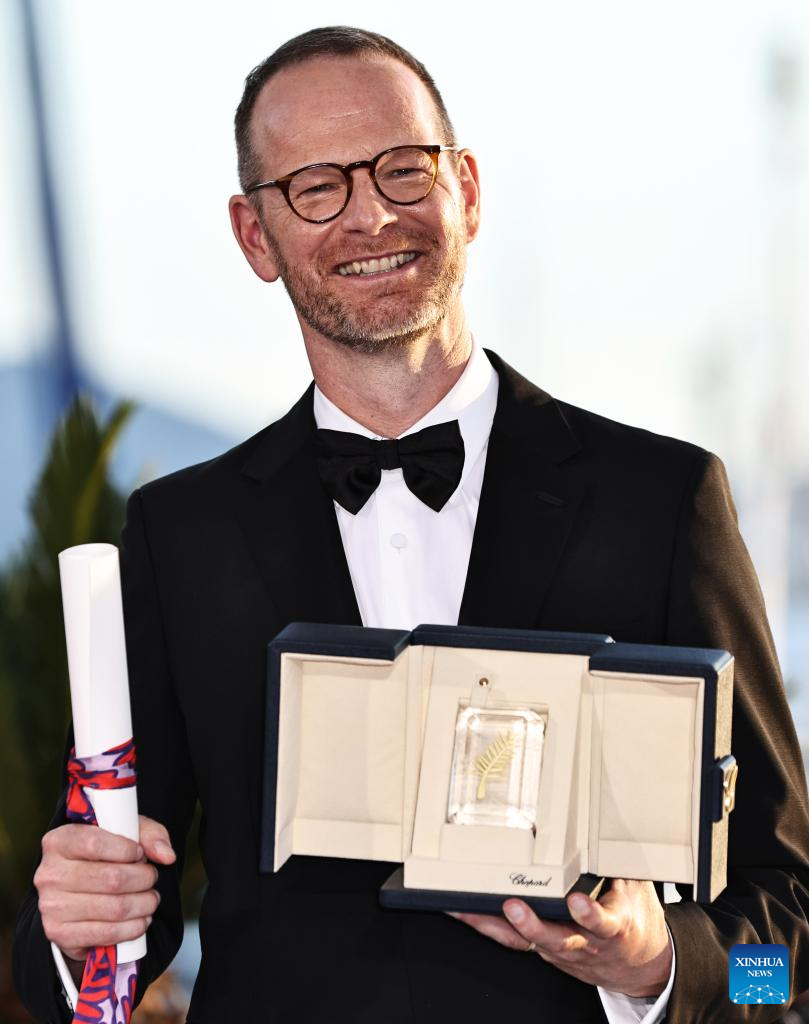CANNES, 25 mayo, 2025 (Xinhua) -- Imagen del 24 de mayo de 2025 del director noruego, Joachim Trier, posando en una sesión fotográfica con su trofeo después de ganar el Gran Premio por la película "Sentimental Value" durante la ceremonia de clausura de la 78ª edición del Festival de Cine de Cannes, en Cannes, en el sur de Francia. (Xinhua/Gao Jing)
