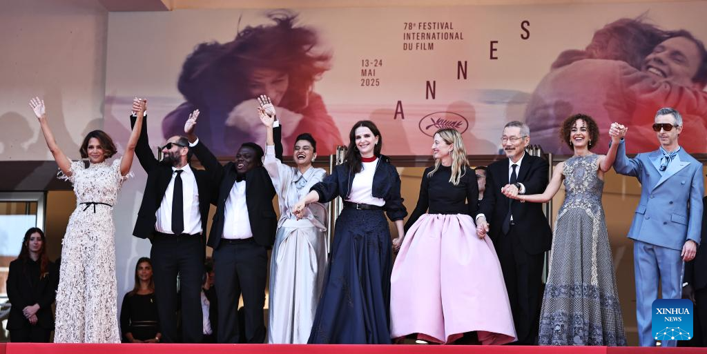 CANNES, 25 mayo, 2025 (Xinhua) -- Imagen del 24 de mayo de 2025 de la actriz francesa y presidenta del jurado de la 78ª edición del Festival de Cine de Cannes, Juliette Binoche (c), llegando con el jurado a la alfombra roja de la ceremonia de clausura de la 78ª edición del Festival de Cine de Cannes, en Cannes, en el sur de Francia. (Xinhua/Gao Jing)