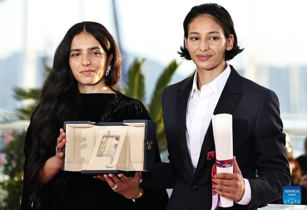 CANNES, 25 mayo, 2025 (Xinhua) -- Imagen del 24 de mayo de 2025 de la actriz francesa, Nadia Melliti (d) y la directora, Hafsia Herzi, posando en una sesión fotográfica durante la ceremonia de clausura de la 78ª edición del Festival de Cine de Cannes, en Cannes, en el sur de Francia. Nadia Melliti ganó el Premio a Mejor Actriz por su participación en la película "La Petite derniere" (La Hermana Pequeña). (Xinhua/Gao Jing)
