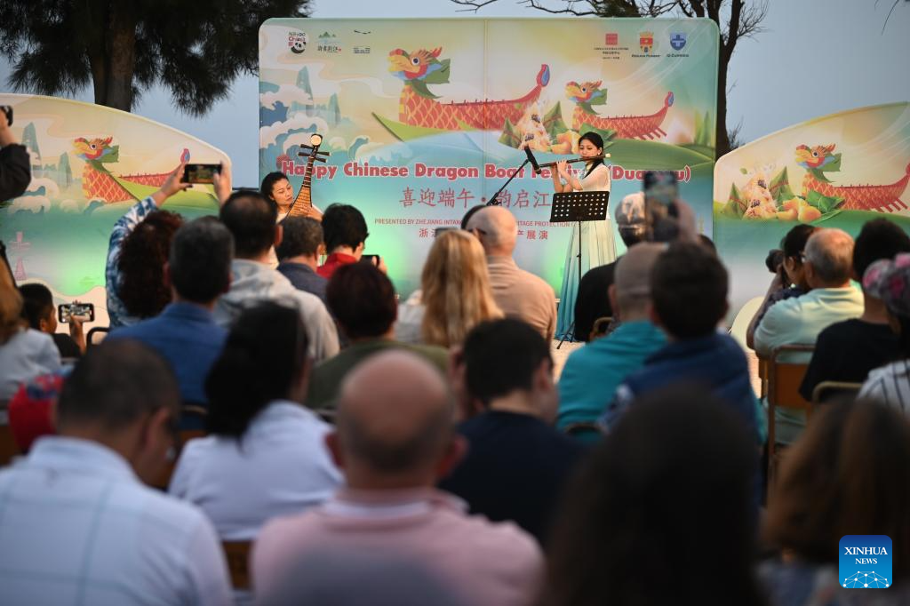 ZURRIEQ, 25 mayo, 2025 (Xinhua) -- Imagen del 24 de mayo de 2025 de personas observando una presentación de arte chino, en Zurrieq, Malta. Una vibrante exhibición de artes tradicionales chinas, incluyendo música, danza y marionetas, tuvo lugar el sábado por la noche en Zurrieq, en el oeste de Malta, para celebrar el próximo Festival del Bote del Dragón chino. (Xinhua/Jonathan Borg)