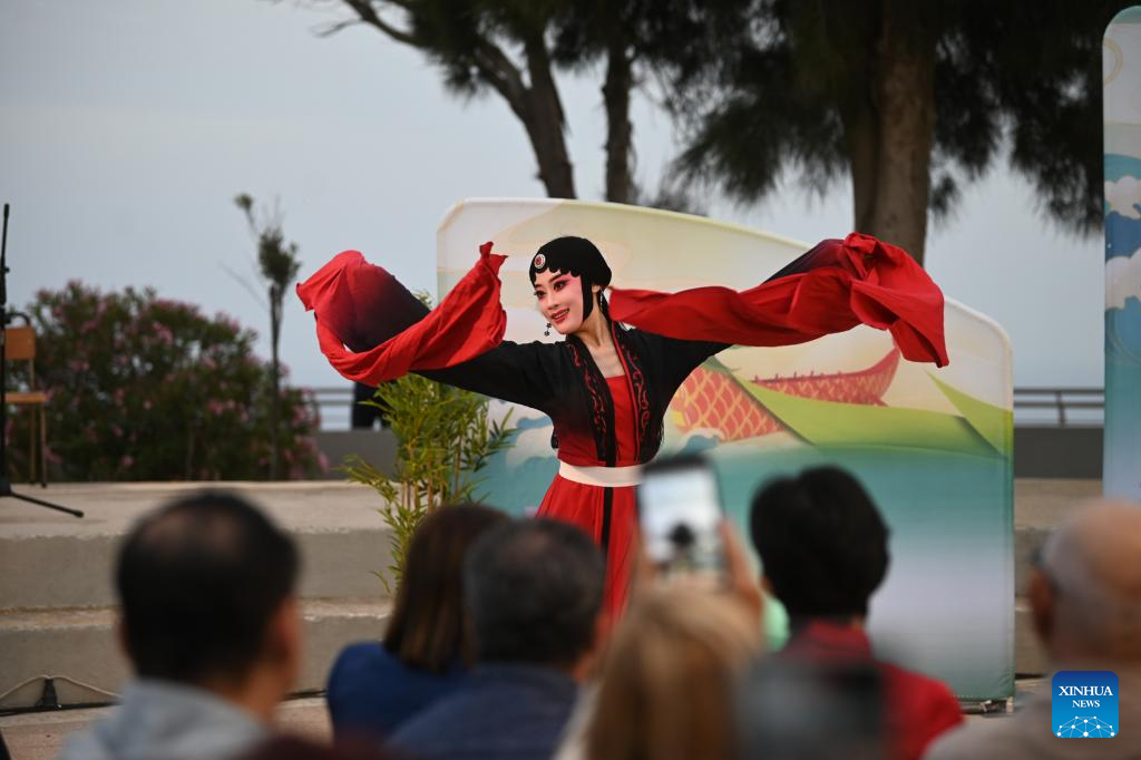 ZURRIEQ, 25 mayo, 2025 (Xinhua) -- Imagen del 24 de mayo de 2025 de una artista china realizando una presentación de una danza de la manga de agua, en Zurrieq, Malta. Una vibrante exhibición de artes tradicionales chinas, incluyendo música, danza y marionetas, tuvo lugar el sábado por la noche en Zurrieq, en el oeste de Malta, para celebrar el próximo Festival del Bote del Dragón chino. (Xinhua/Jonathan Borg)