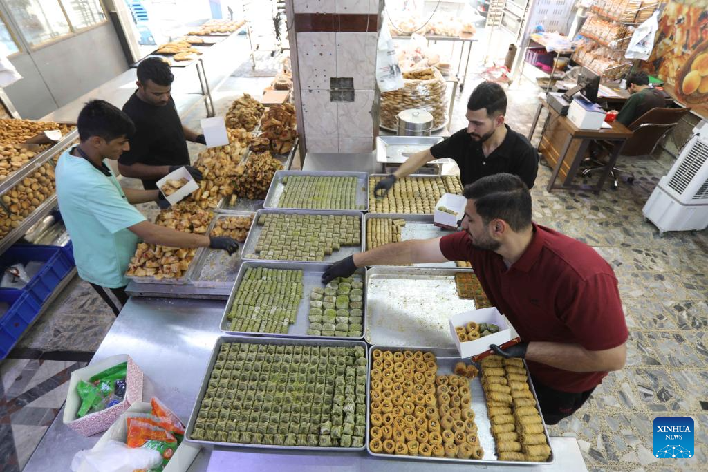 BAGDAD, 7 junio, 2025 (Xinhua) -- Imagen del 6 de junio de 2025 de trabajadores preparando dulces tradicionales en una tienda durante el Eid al-Adha, en Bagdad, Irak. (Xinhua/Khalil Dawood)