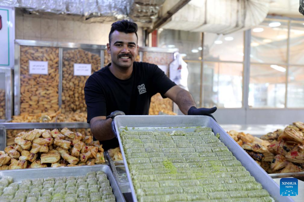 BAGDAD, 7 junio, 2025 (Xinhua) -- Imagen del 6 de junio de 2025 de un hombre mostrando dulces tradicionales en una tienda durante el Eid al-Adha, en Bagdad, Irak. (Xinhua/Khalil Dawood)