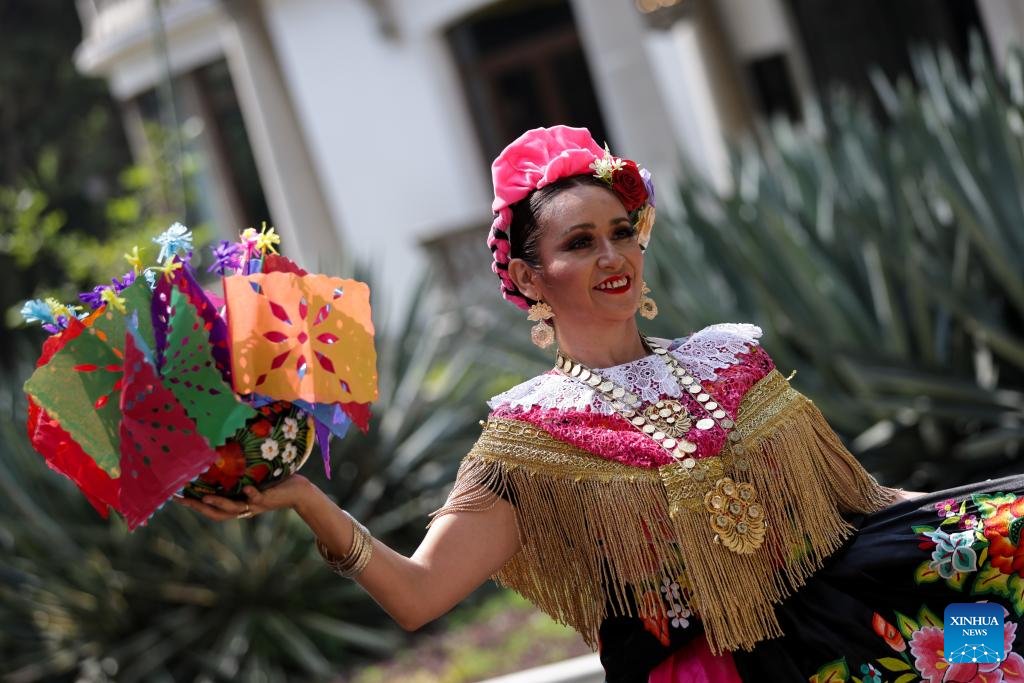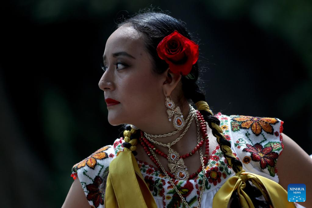 CIUDAD DE MEXICO, 10 junio, 2025 (Xinhua) -- Una mujer porta un traje tradicional durante la presentación de "Julio, mes de la Guelaguetza 2025", en el Complejo Cultural Los Pinos, en la Ciudad de México, capital de México, el 10 de junio de 2025. (Xinhua/Francisco Cañedo)