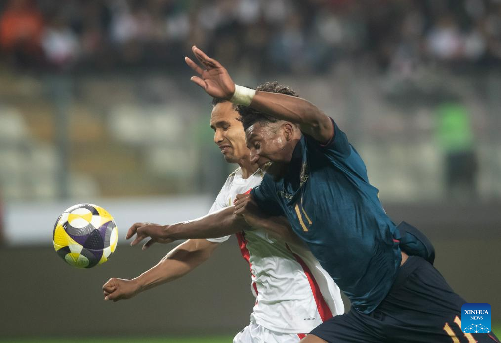 LIMA, 11 junio, 2025 (Xinhua) -- Imagen del 10 de junio de 2025 de André Carrillo (d), de Perú, disputando el balón con Kevin Rodríguez (i), de Ecuador, durante el partido correspondiente a las Eliminatorias Sudamericanas para el Mundial de Estados Unidos, México y Canadá 2026 celebrado en el Estadio Nacional, en Lima, Perú. (Xinhua/Mariana Bazo)