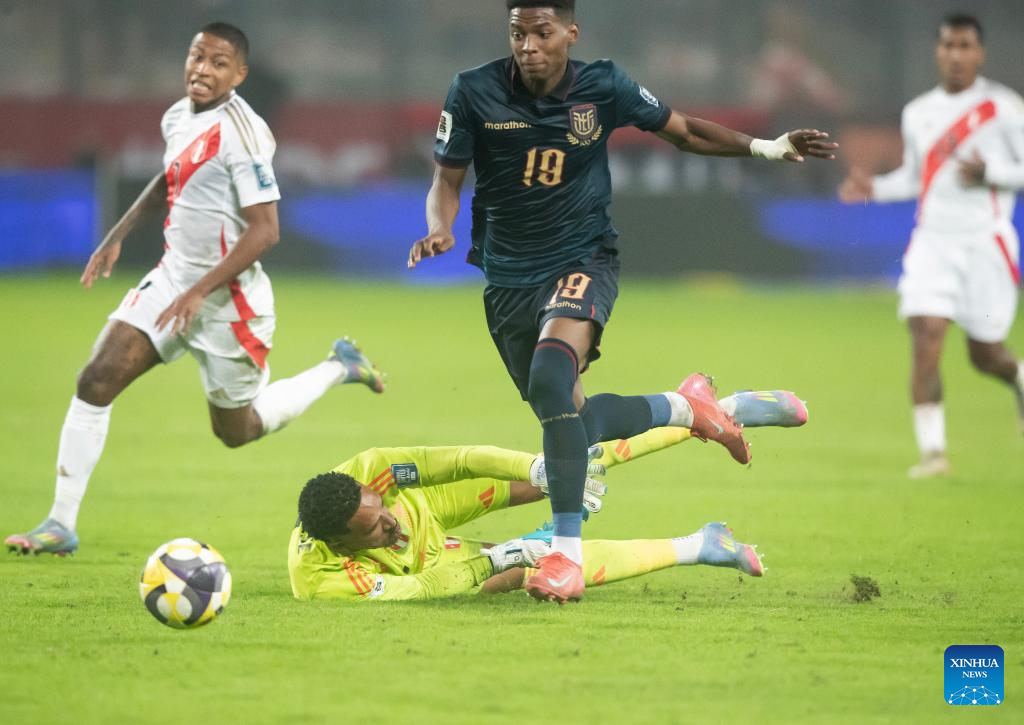 LIMA, 11 junio, 2025 (Xinhua) -- Imagen del 10 de junio de 2025 del guardameta, Pedro Gallese (abajo), de Perú, disputando el balón con Nilson Angulo (frente), de Ecuador, durante el partido correspondiente a las Eliminatorias Sudamericanas para el Mundial de Estados Unidos, México y Canadá 2026 celebrado en el Estadio Nacional, en Lima, Perú. (Xinhua/Mariana Bazo)