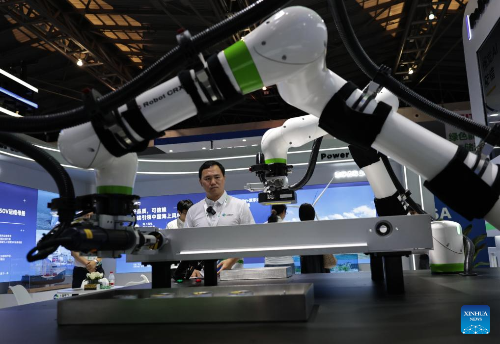 SHANGHAI, 11 junio, 2025 (Xinhua) -- Un trabajador observa mientras robots colaborativos demuestran operaciones de ensamblaje de paquetes de baterías y verificación de cableado durante la 11ª Feria Internacional de Tecnología de China (Shanghai) (CSITF, por sus siglas en inglés), en Shanghai, en el este de China, el 11 de junio de 2025. Alrededor de 1.000 expositores de casi 20 países y regiones mostraron aquí sus logros innovadores. (Xinhua/Fang Zhe)