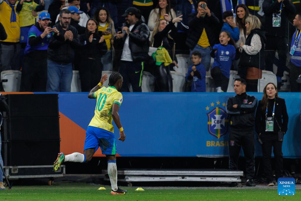 SAO PAULO, 11 junio, 2025 (Xinhua) -- Imagen del 10 de junio de 2025 del jugador Vinicius Júnior (d), de Brasil, festejando después de anotar durante el partido ante Paraguay correspondiente a las Eliminatorias Sudamericanas para el Mundial de Estados Unidos, México y Canadá 2026, celebrado en el estadio Neo Química Arena, en Sao Paulo, Brasil. (Xinhua/Claudia Martini)