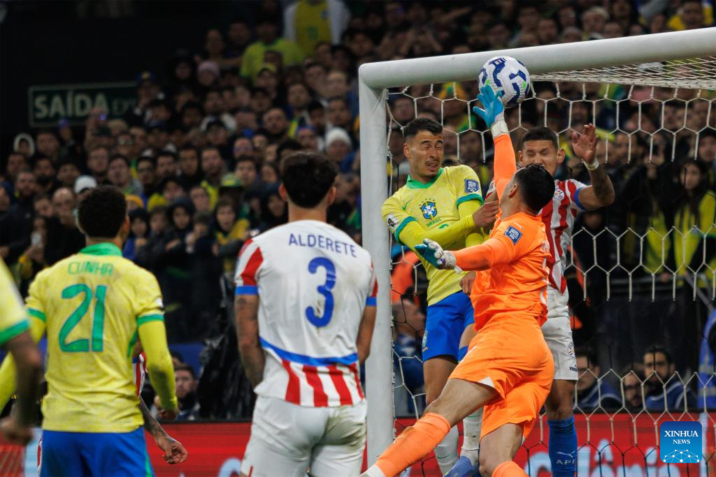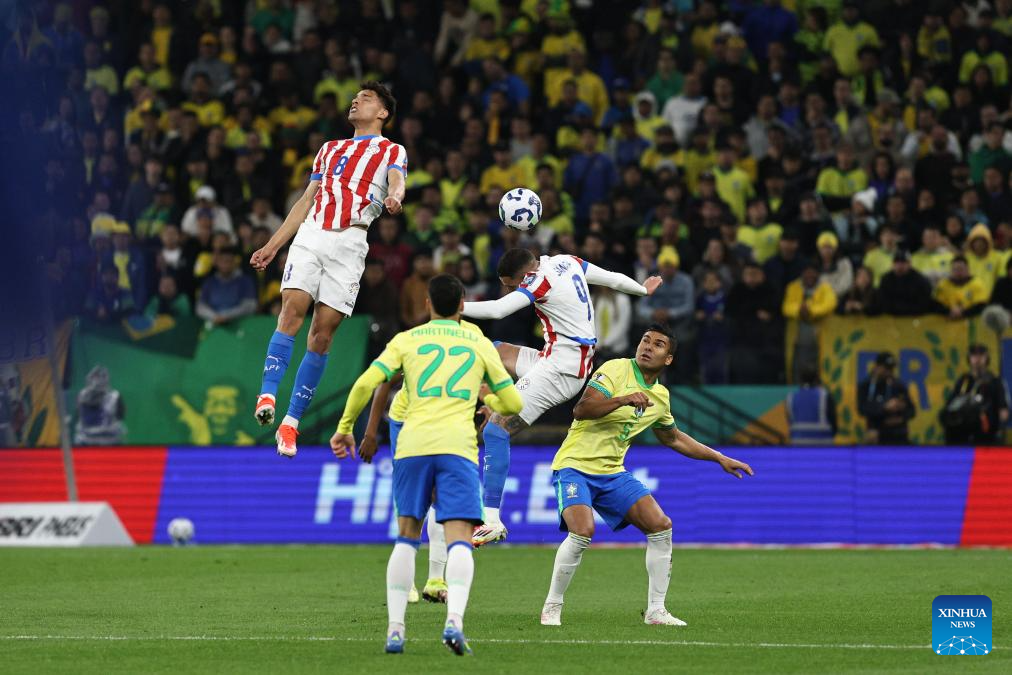 SAO PAULO, 11 junio, 2025 (Xinhua) -- Imagen del 10 de junio de 2025 de los jugadores Diego Gómez (i-arriba) y Antonio Sanabria (2-d), de Paraguay, compitiendo durante el partido ante Brasil correspondiente a las Eliminatorias Sudamericanas para el Mundial de Estados Unidos, México y Canadá 2026, celebrado en el estadio Neo Química Arena, en Sao Paulo, Brasil. (Xinhua/Claudia Martini)