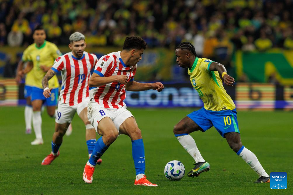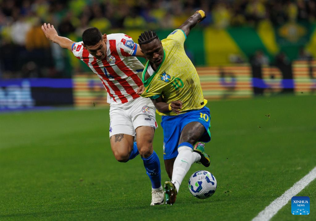 SAO PAULO, 11 junio, 2025 (Xinhua) -- Imagen del 10 de junio de 2025 del jugador Vinicius Júnior (d), de Brasil, controlando el balón durante el partido ante Paraguay correspondiente a las Eliminatorias Sudamericanas para el Mundial de Estados Unidos, México y Canadá 2026, celebrado en el estadio Neo Química Arena, en Sao Paulo, Brasil. (Xinhua/Claudia Martini)