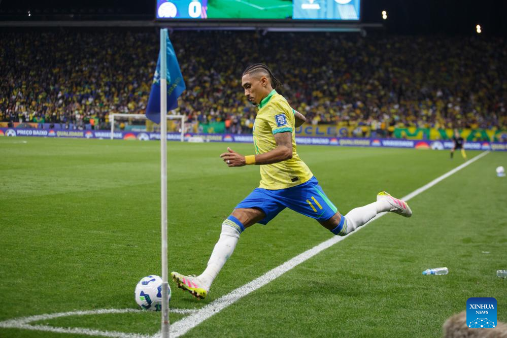 SAO PAULO, 11 junio, 2025 (Xinhua) -- Imagen del 10 de junio de 2025 del jugador Raphinha, de Brasil, realizando un tiro de esquina durante el partido ante Paraguay correspondiente a las Eliminatorias Sudamericanas para el Mundial de Estados Unidos, México y Canadá 2026, celebrado en el estadio Neo Química Arena, en Sao Paulo, Brasil. (Xinhua/Claudia Martini)